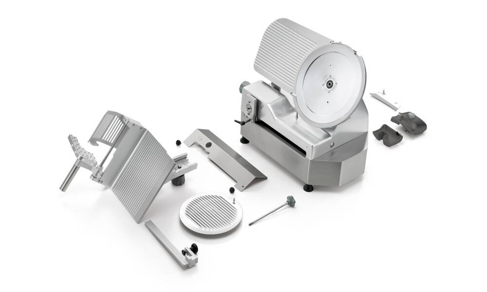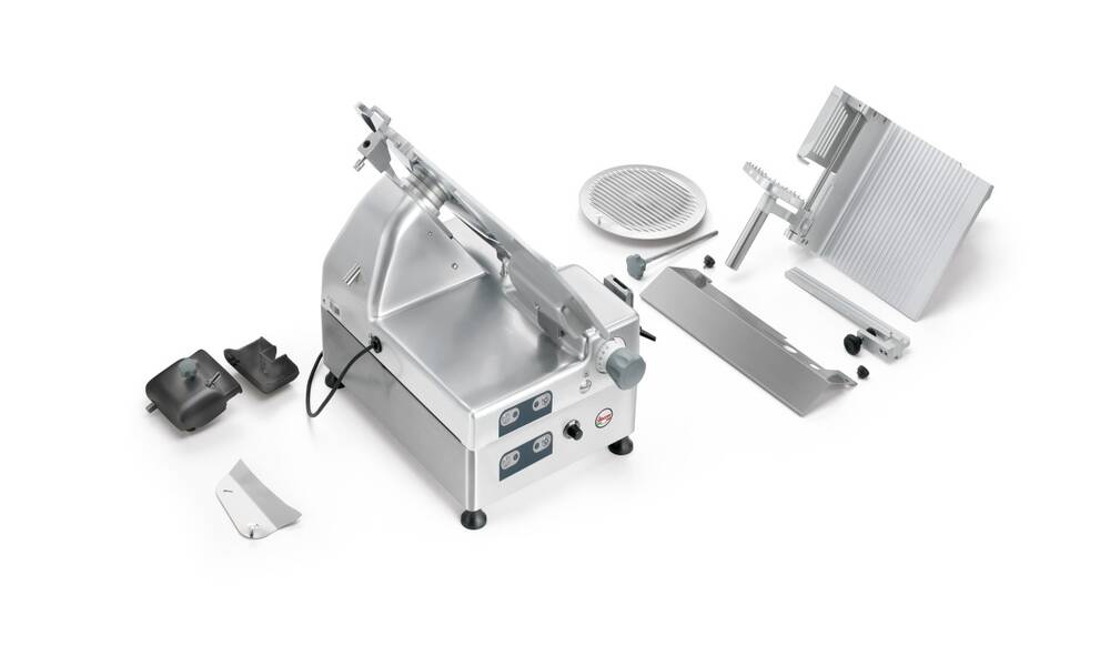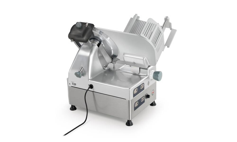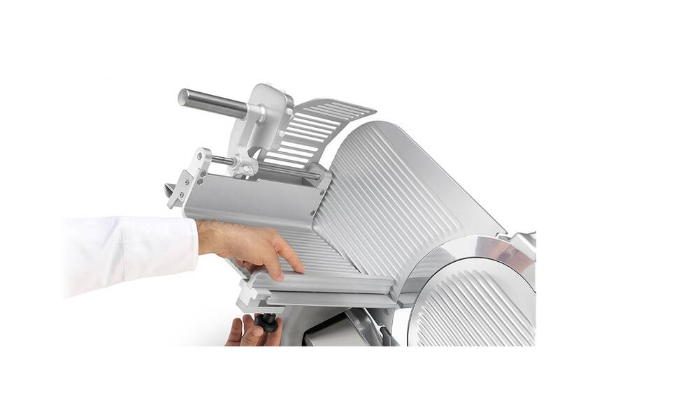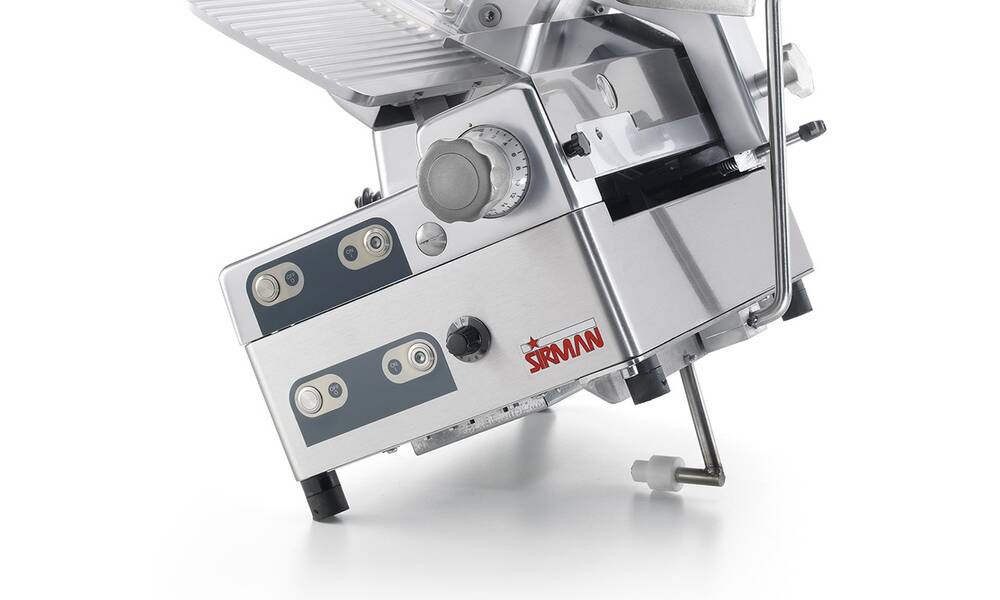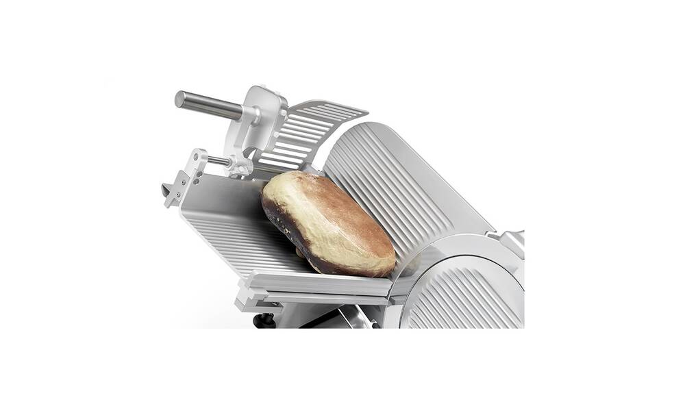 Nářezový stroj PALLADIO AUTOMEC 350 FROZEN s nerezovým nožem o průměru 350 mm s uložením posuvného stolu našikmo, od itaslkého výrobce SIRMAN.