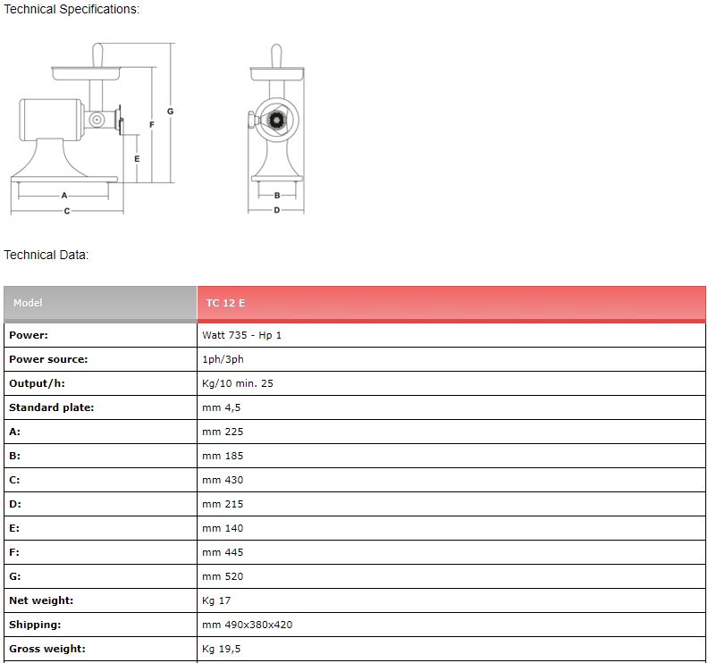 Mlýnek na maso TC 12 E, 230 V od italského výrobce SIRMAN
